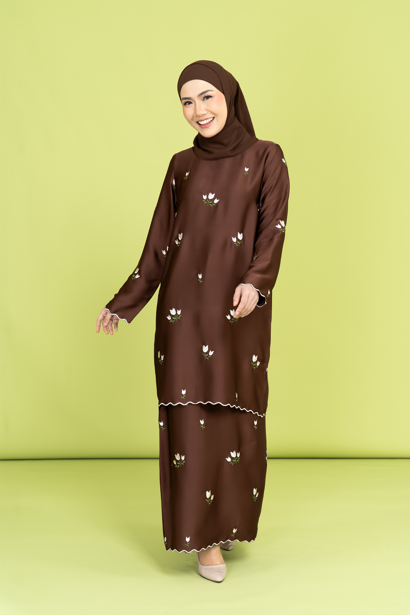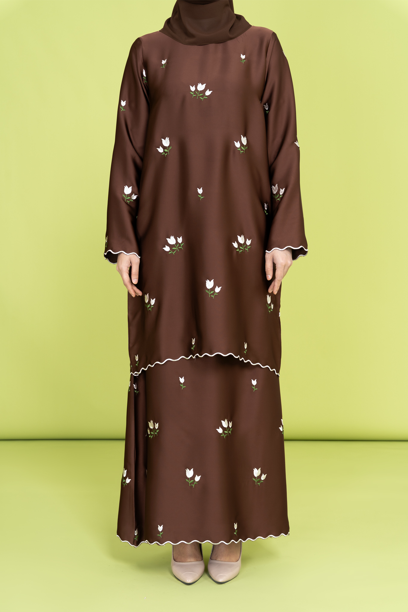 Tulip Embroidered Kurung in Brown